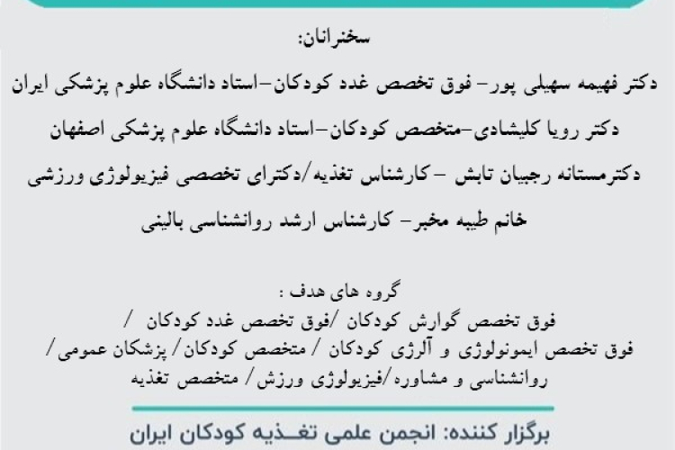 انجمن علمی تغذیه کودکان ایران با همکاری مرکز تخصصی رشد و تکامل کودکان دنیا و مرکز تحقیقات رشد و نمو کودکان وبینار چاقی در کودکان و نوجوانان را در تاریخ 27 شهریور 1404 از ساعت 9 تا 12 برگزار می نماید.
